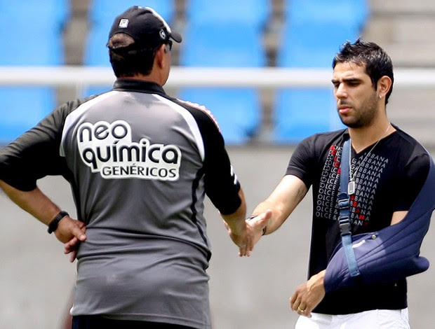 Com uma tipoia no ombro esquerdo, Herrera cumprimenta Joel Santana em treino do Botafogo. Argentino será operado neste sábado (Foto: Alexandre Cassiano / Agência O Globo)
